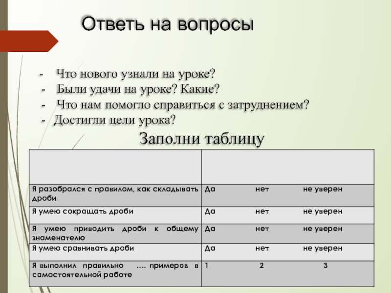 Ответь на вопросы-  Что нового узнали на уроке? Были удачи на уроке? Какие? Что нам помогло