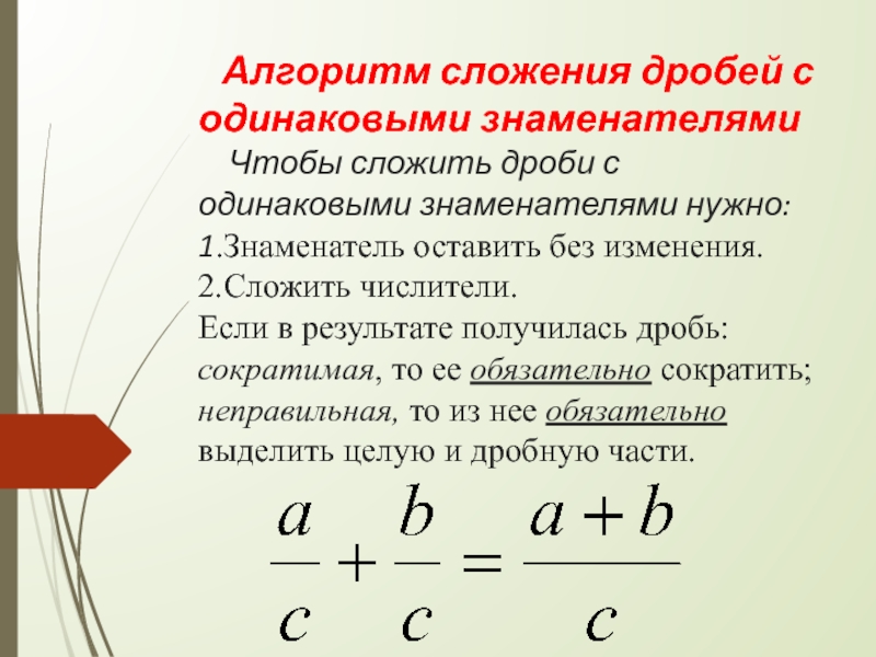 Алгоритм сложения дробей с одинаковыми знаменателями   Чтобы сложить дроби с одинаковыми знаменателями нужно:
