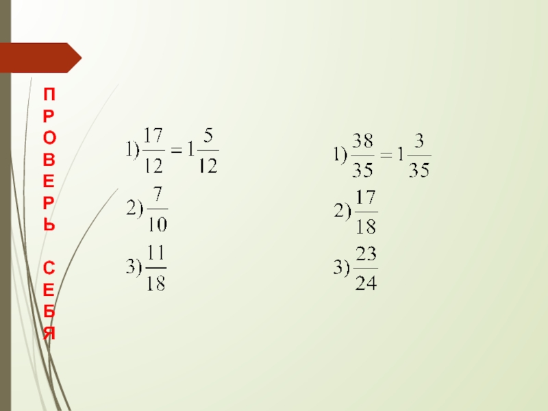 дроби с одинаковыми знаменателями нужно: 1.Знаменатель оставить без изменения. 2.Сложить числители. Если в результате получилась дробь: сократимая, то ее обязательно сократить; неправильная, то из нее обязательно выделить целую и дробную части.