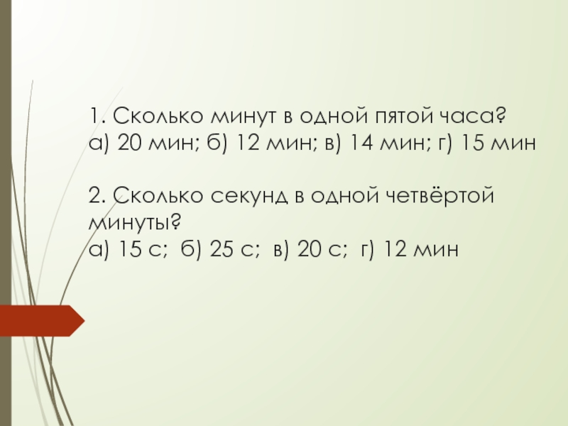 мин; в) 14 мин; г) 15 мин 2. Сколько секунд в одной четвёртой минуты? а) 15 с; б) 25 с; в) 20 с; г) 12 мин