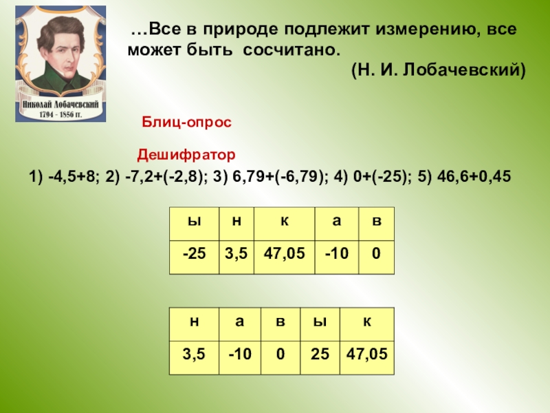 1) -4,5+8; 2) -7,2+(-2,8); 3) 6,79+(-6,79); 4) 0+(-25); 5) 46,6+0,45