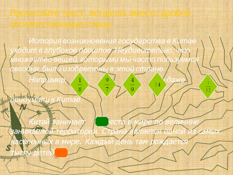Прочитайте текст, вставляя вместо дробей соответствующие слова.