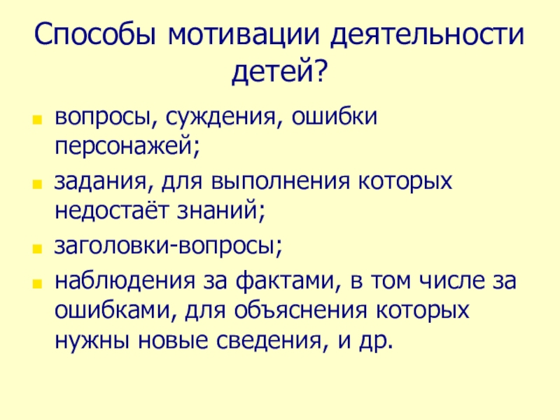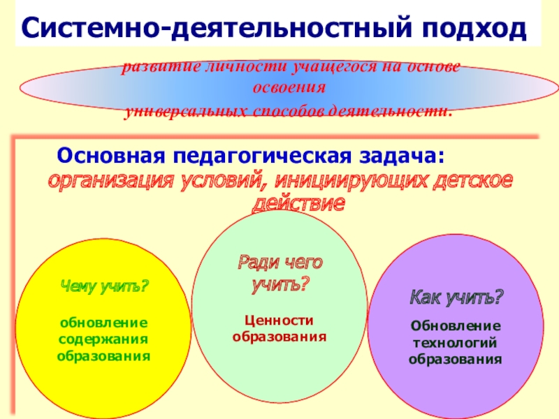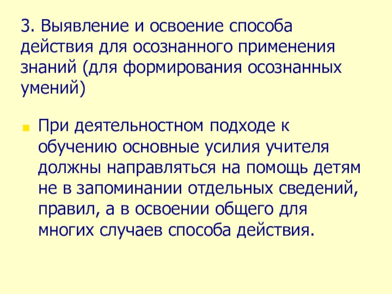 При деятельностном подходе к обучению основные усилия учителя должны направляться на помощь детям не в запоминании отдельных сведений, правил, а в освоении общего для многих случаев способа действия.