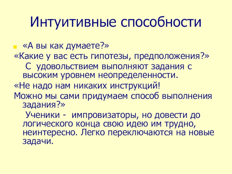 Ученики - импровизаторы, но довести до логического конца свою идею им трудно, неинтересно. Легко переключаются на новые задачи.