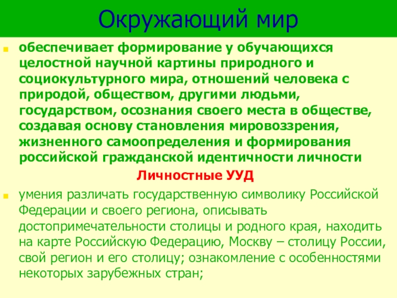 Формирование целостной картины мира, адекватной современному уровню научного знания