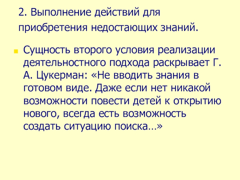 деятельностного подхода раскрывает Г.А. Цукерман: «Не вводить знания в готовом виде. Даже если нет никакой возможности повести детей к открытию нового, всегда есть возможность создать ситуацию поиска…»