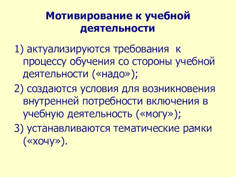 2) создаются условия для возникновения внутренней потребности включения в учебную деятельность («могу»);