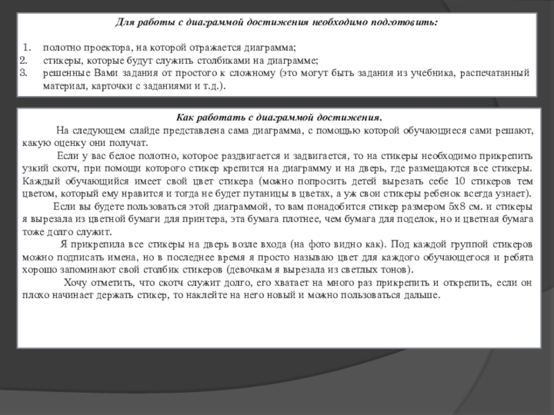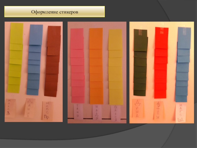 Если у вас белое полотно, которое раздвигается и задвигается, то на стикеры необходимо прикрепить узкий скотч, при помощи которого стикер крепится на диаграмму и на дверь, где размещаются все стикеры. Каждый обучающийся имеет свой цвет стикера (можно попросить детей вырезать себе 10 стикеров тем цветом, который ему нравится и тогда не будет путаницы в цветах, а уж свои стикеры ребенок всегда узнает).