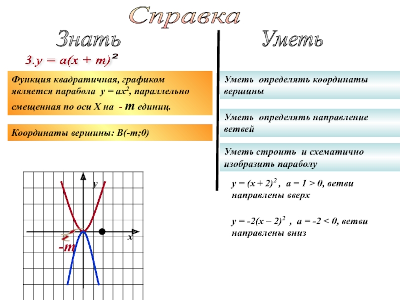 Функция квадратичная, графиком является парабола у = ах2, параллельно смещенная по оси X на - m единиц.