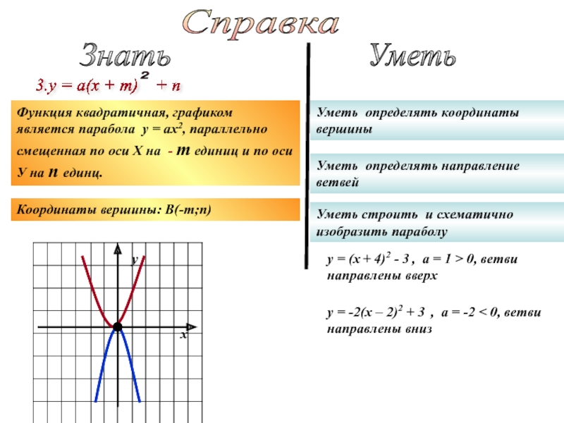Функция квадратичная, графиком является парабола у = ах2, параллельно смещенная по оси X на - m единиц и по оси У на n единц.
