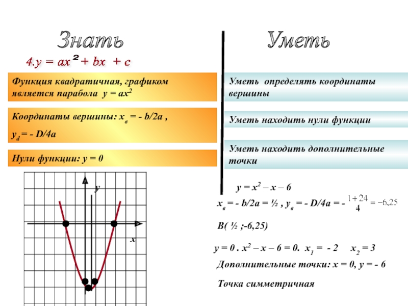 у = 0 . х2 – х – 6 = 0. х1 = - 2 х2 = 3