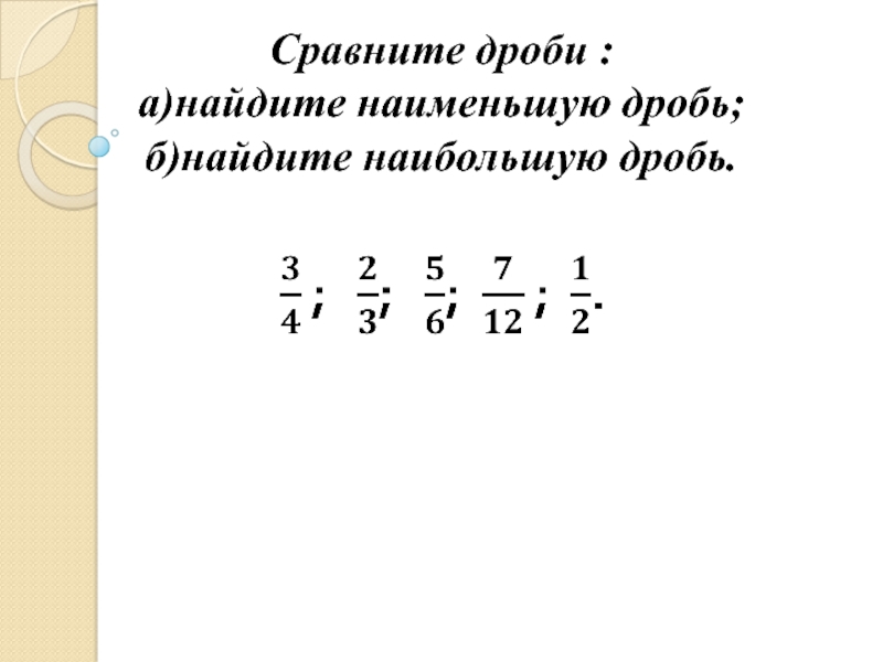 Слайд 8Сравните дроби : а)найдите наименьшую дробь; б)найдите наибольшую дробь.