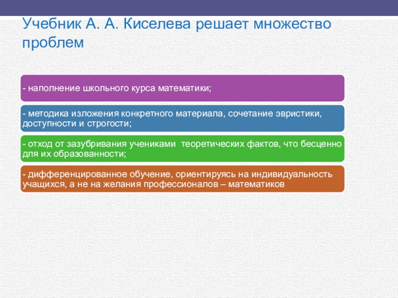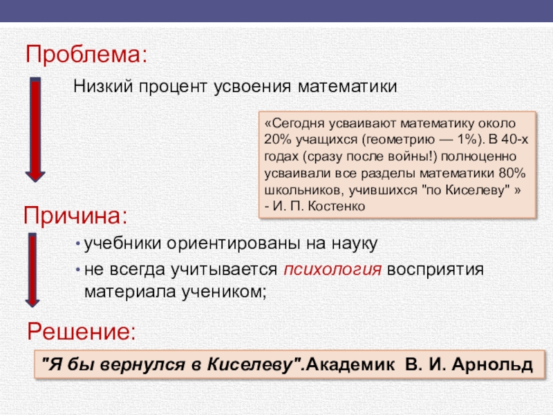 «Сегодня усваивают математику около 20% учащихся (геометрию — 1%). В 40-х годах (сразу после войны!) полноценно усваивали все разделы математики 80% школьников, учившихся "по Киселеву" » - И. П. Костенко
