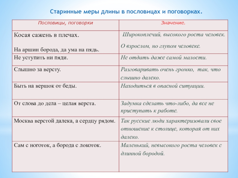 выяснить, что обозначают пословицы и поговорки, содержащие упоминания о старинных мерах длины;