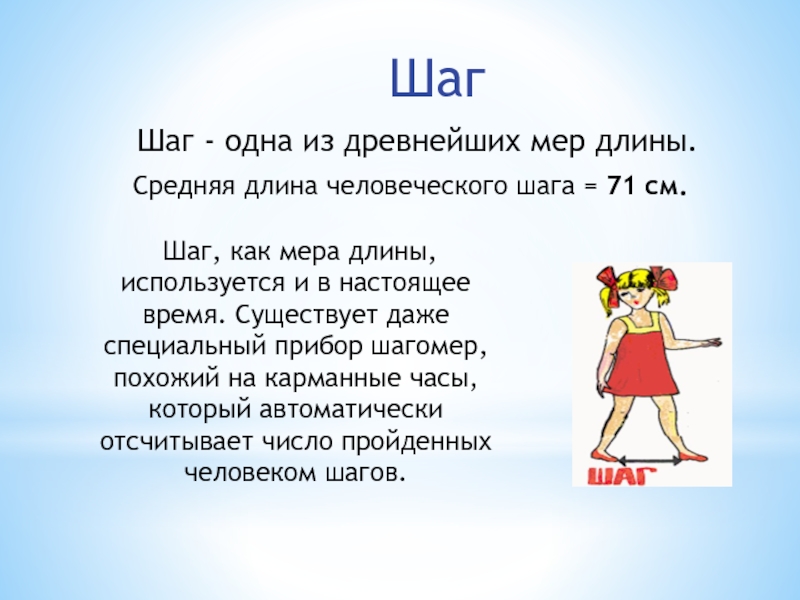 Шаг, как мера длины, используется и в настоящее время. Существует даже специальный прибор шагомер, похожий на карманные часы, который автоматически отсчитывает число пройденных человеком шагов.