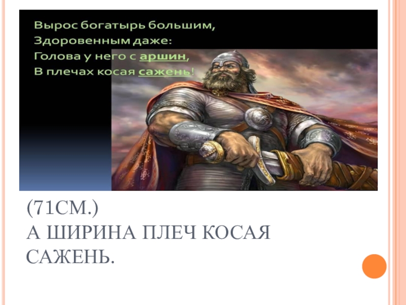 Слайд 11ГОЛОВА БОГАТЫРЯ 1АРШЫН(71СМ.) А ШИРИНА ПЛЕЧ КОСАЯ САЖЕНЬ.
