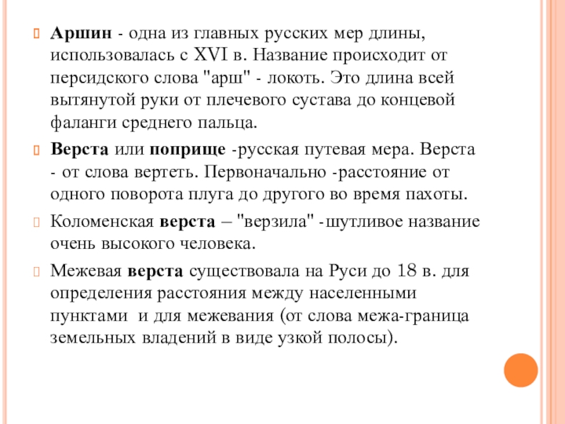 Слайд 4Аршин - одна из главных русских мер длины, использовалась с XVI в.