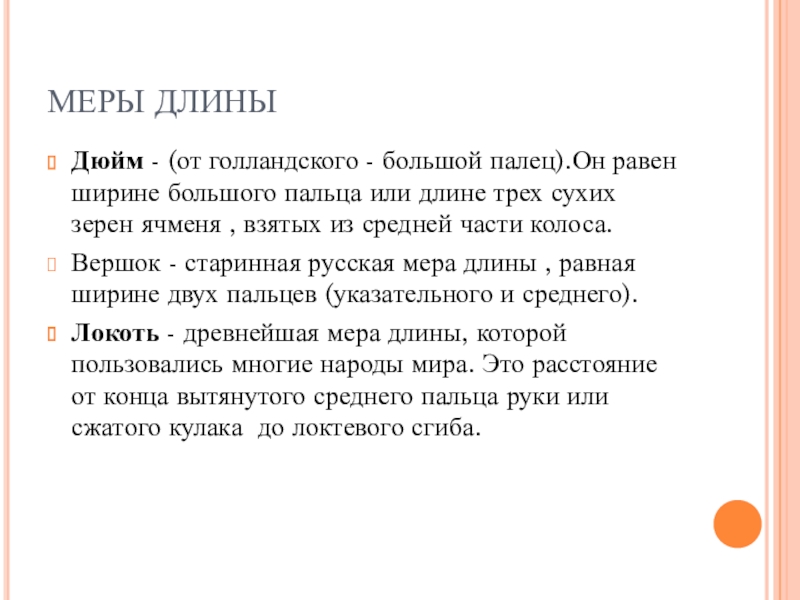 МЕРЫ ДЛИНЫ Дюйм - (от голландского - большой палец).Он равен ширине большого пальца или длине трех сухих зерен