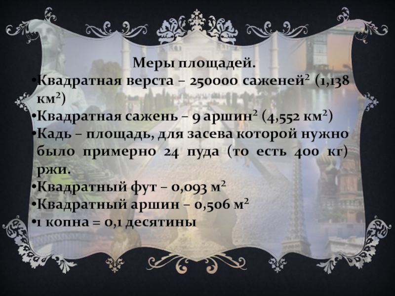 При Петре I в системе единиц площади прочно утвердились квадратные меры.