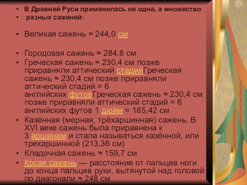 Косая сажень — расстояние от пальцев ноги до конца пальцев руки, вытянутой над головой по диагонали ≈ 248 см