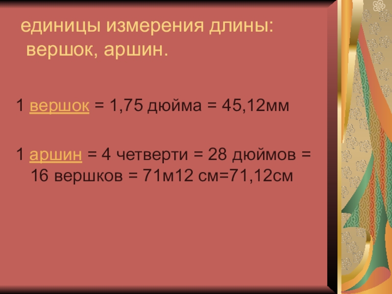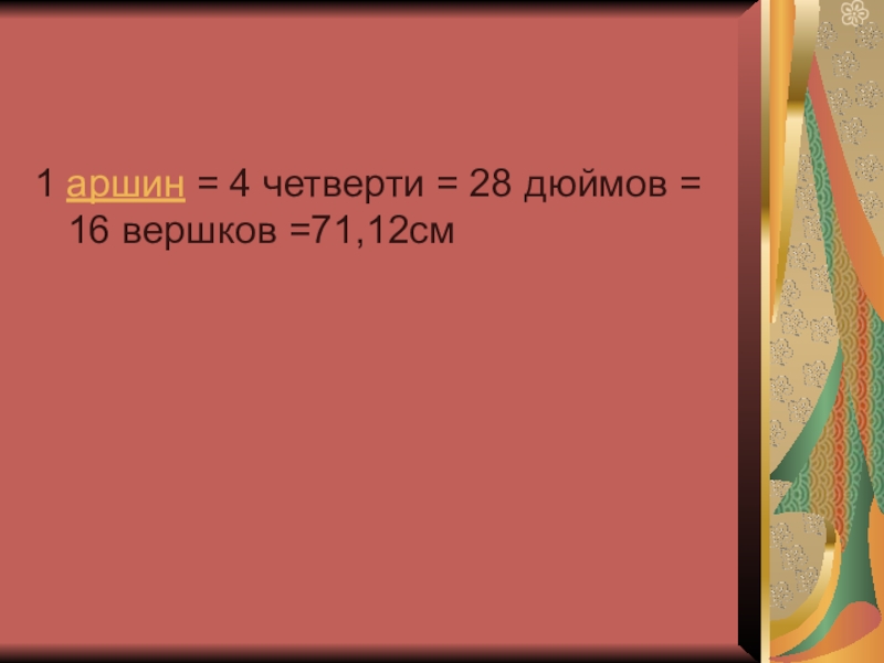 1 аршин = 4 четверти = 28 дюймов = 16 вершков =71,12см