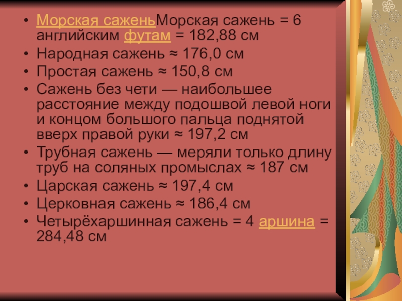 Морская саженьМорская сажень = 6 английским футам = 182,88 см