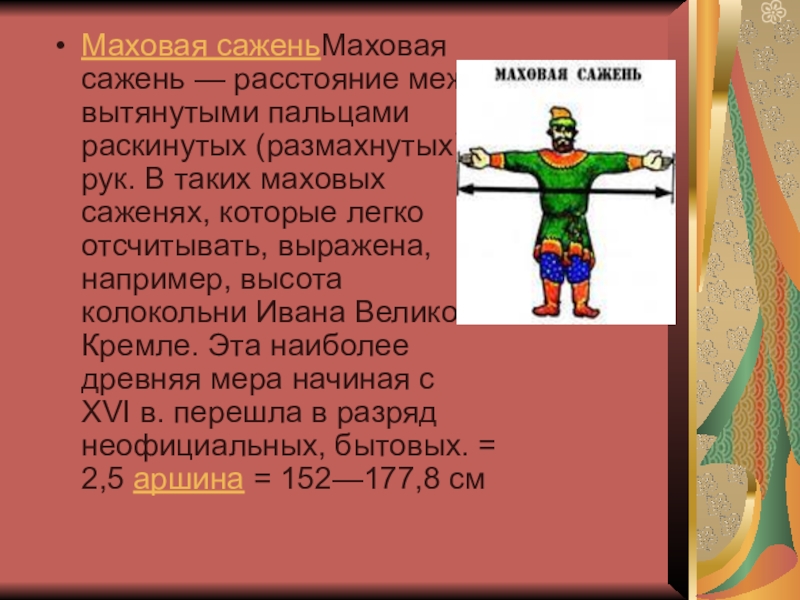 таких маховых саженях, которые легко отсчитывать, выражена, например, высота колокольни Ивана Великого в Кремле. Эта наиболее древняя мера начиная с XVI в. перешла в разряд неофициальных, бытовых. = 2,5 аршина = 152—177,8 см