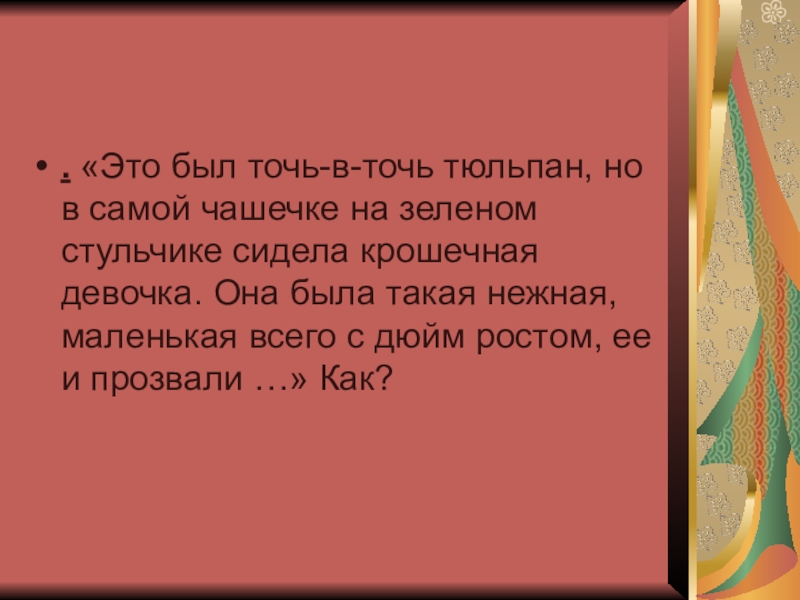 сидела крошечная девочка. Она была такая нежная, маленькая всего с дюйм ростом, ее и прозвали …» Как?