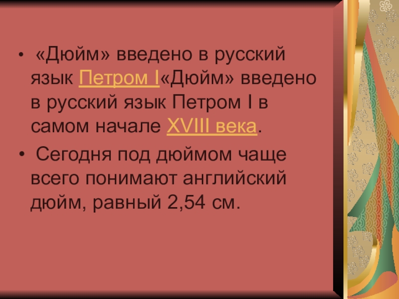 «Дюйм» введено в русский язык Петром I«Дюйм» введено