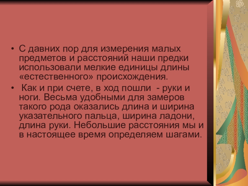 Как и при счете, в ход пошли - руки и ноги. Весьма удобными для замеров такого рода оказались длина и ширина указательного пальца, ширина ладони, длина руки. Небольшие расстояния мы и в настоящее время определяем шагами.