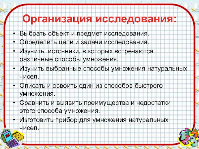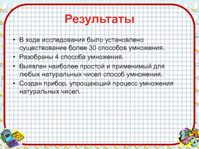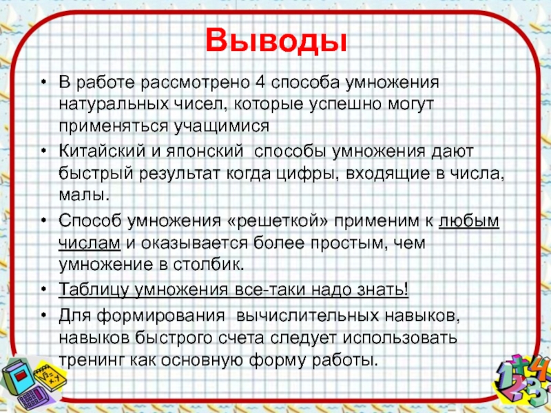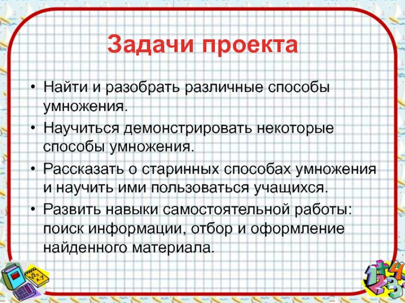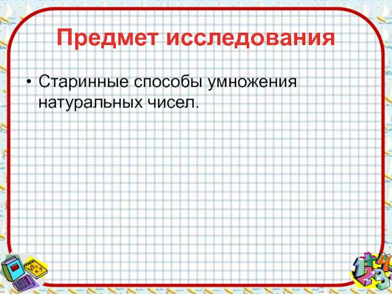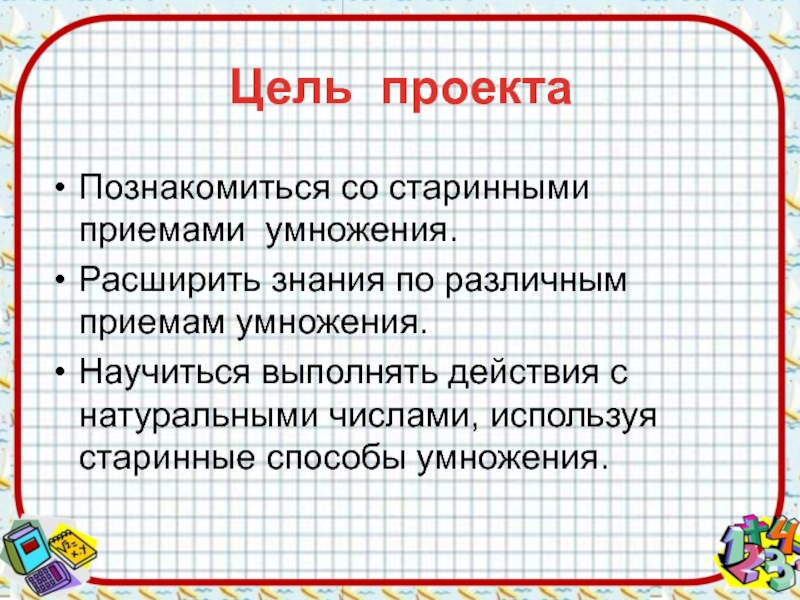 выполнять действия с натуральными числами, используя старинные способы умножения.