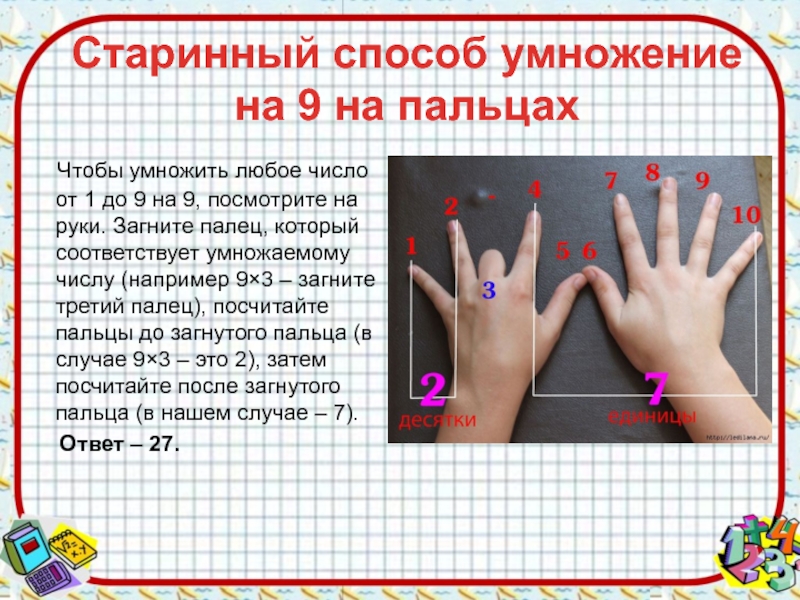 от 1 до 9 на 9, посмотрите на руки. Загните палец, который соответствует умножаемому числу (например 9×3 – загните третий палец), посчитайте пальцы до загнутого пальца (в случае 9×3 – это 2), затем посчитайте после загнутого пальца (в нашем случае – 7).