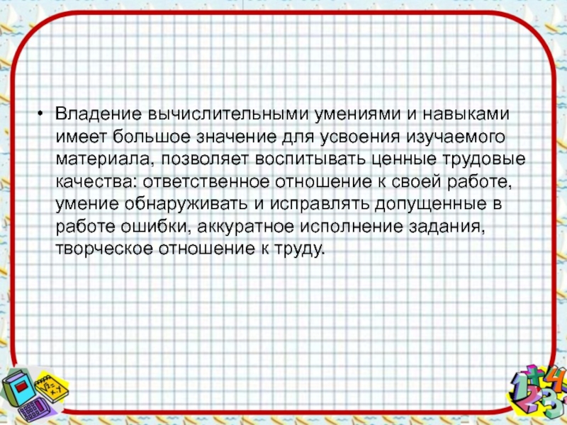 Слайд 8Владение вычислительными умениями и навыками имеет большое значение для усвоения изучаемого