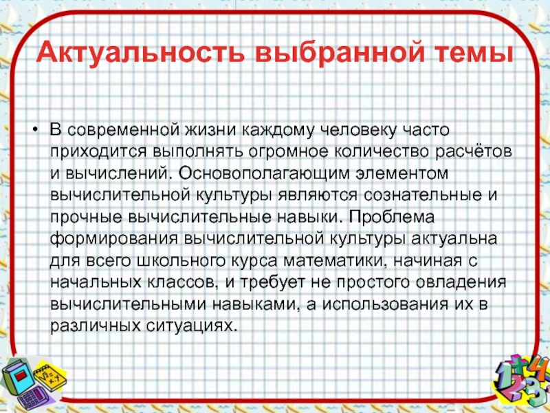 количество расчётов и вычислений. Основополагающим элементом вычислительной культуры являются сознательные и прочные вычислительные навыки. Проблема формирования вычислительной культуры актуальна для всего школьного курса математики, начиная с начальных классов, и требует не простого овладения вычислительными навыками, а использования их в различных ситуациях.