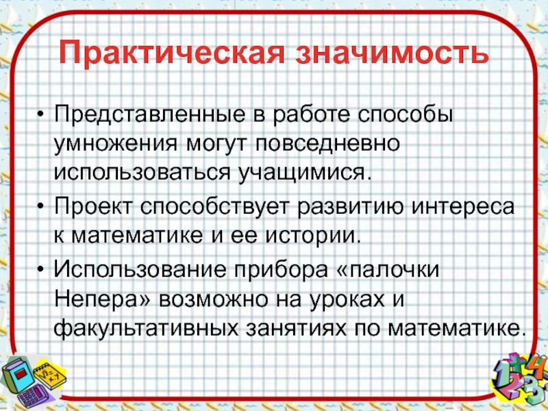Использование прибора «палочки Непера» возможно на уроках и факультативных занятиях по математике.