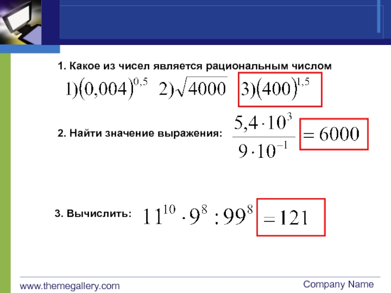 www.themegallery.comCompany Name1. Какое из чисел является рациональным числом2. Найти значение выражения:3. Вычислить:
