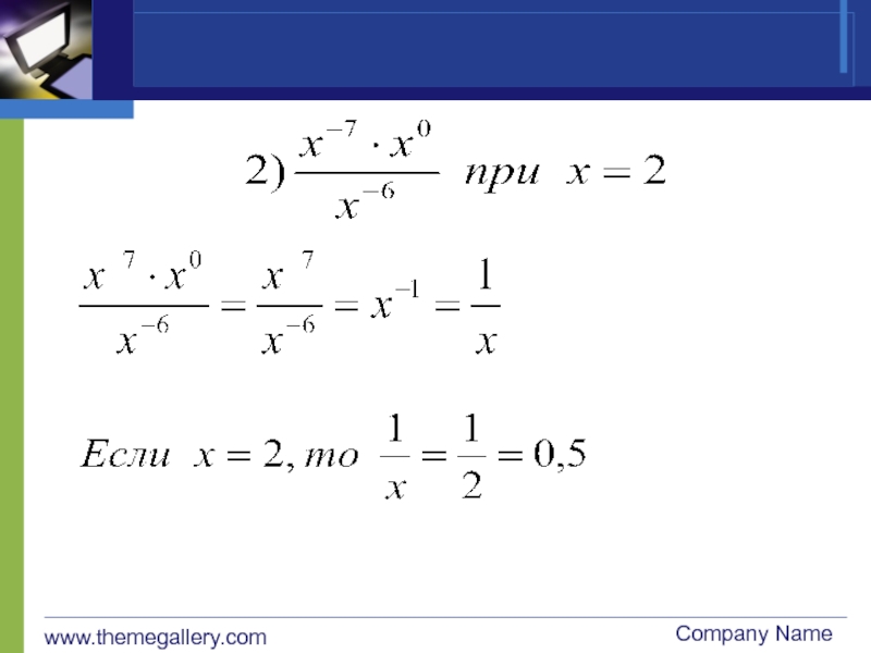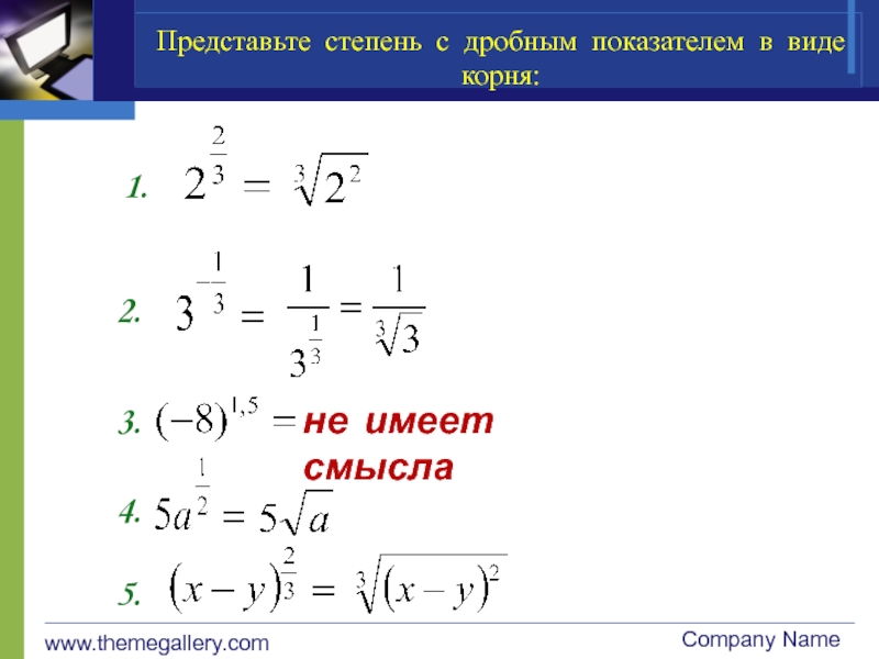 www.themegallery.comCompany NameПредставьте степень с дробным показателем в виде корня:1.2.3.не имеет смысла4.5.