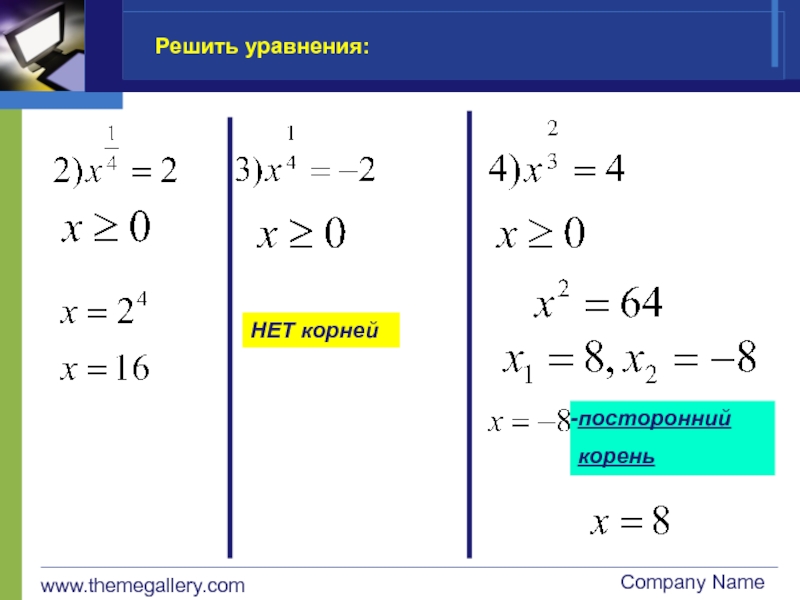 www.themegallery.comCompany NameРешить уравнения:НЕТ корнейпостороннийкорень