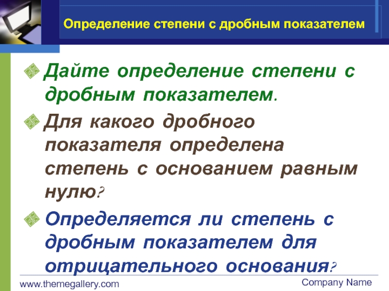 www.themegallery.comCompany NameОпределение степени с дробным показателемДайте определение степени с дробным показателем.Для какого дробного показателя определена степень с