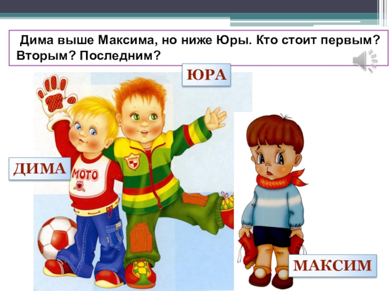 Дима выше Максима, но ниже Юры. Кто стоит первым? Вторым? Последним?ДИМАМАКСИМЮРА