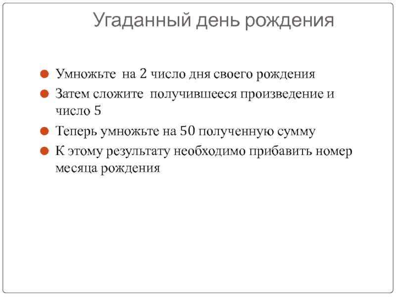 Угаданный день рождения Умножьте на 2 число дня своего рожденияЗатем сложите