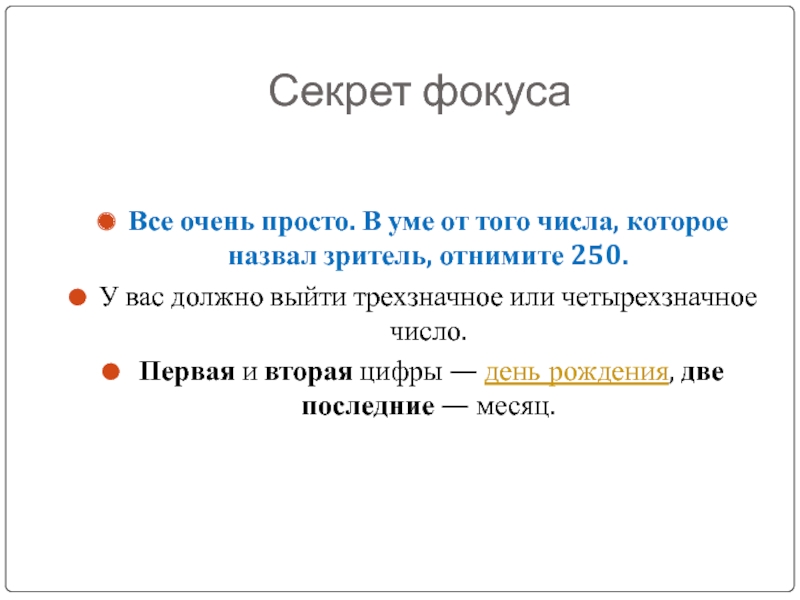 Секрет фокусаВсе очень просто. В уме от того числа, которое назвал зритель, отнимите 250.У вас должно выйти