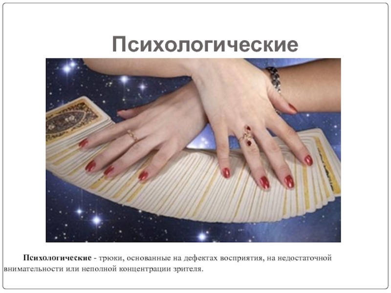 ПсихологическиеПсихологические - трюки, основанные на дефектах восприятия, на недостаточной внимательности или неполной концентрации зрителя.