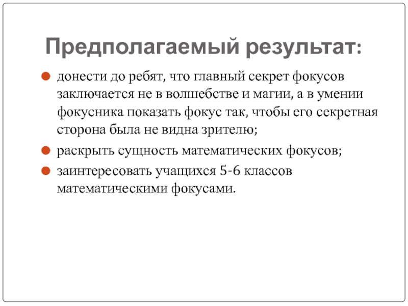 Предполагаемый результат:донести до ребят, что главный секрет фокусов заключается не в волшебстве и магии, а в умении