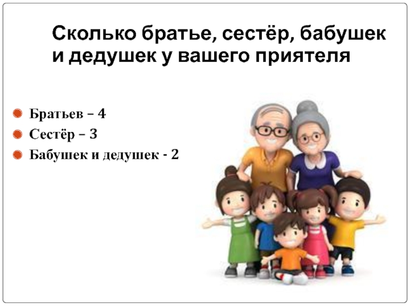 Сколько братье, сестёр, бабушек и дедушек у вашего приятеляБратьев – 4Сестёр – 3Бабушек и дедушек - 2