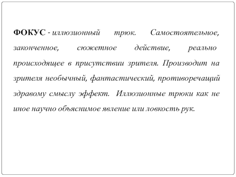 ФОКУС - иллюзионный трюк. Самостоятельное, законченное, сюжетное действие, реально происходящее в присутствии зрителя. Производит на зрителя необычный, фантастический, противоречащий