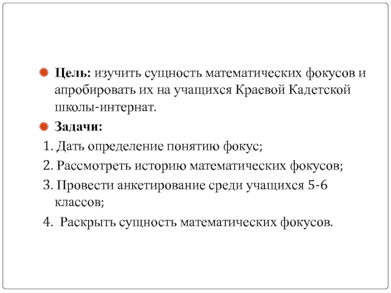 Цель: изучить сущность математических фокусов и апробировать их на учащихся Краевой