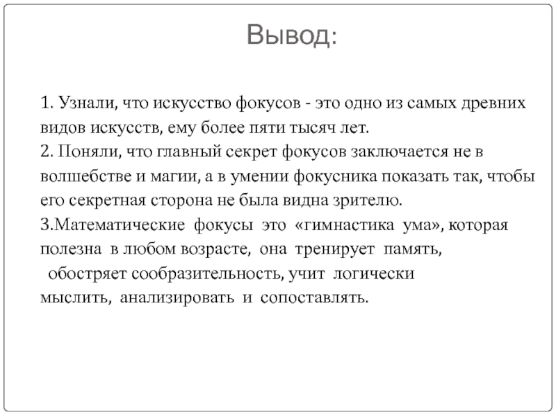 Вывод:1. Узнали, что искусство фокусов - это одно из самых древних видов искусств, ему более пяти тысяч