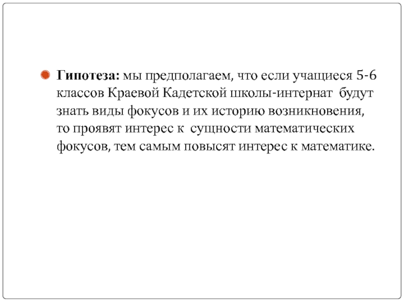 Гипотеза: мы предполагаем, что если учащиеся 5-6 классов Краевой Кадетской школы-интернат будут знать виды фокусов и их