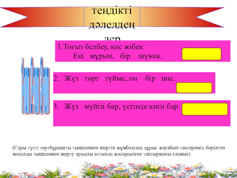 (Сары түсті төртбұрышты тышқанмен шертіп жұмбақтың дұрыс жауабын тексереміз, берілген